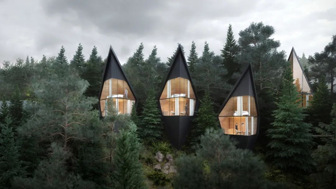樹屋酒店,造型很酷,像是一個小型的太空艙(cāng),又如天外飛仙,光從(cóng)建築構築來看已經足夠吸引人。獨特的造型旨在呼應自然環境中的杉樹和落葉松樹。這些結構由當地的落葉松和杉木制成,外牆木闆染成黑色,與周圍環境融爲一體。