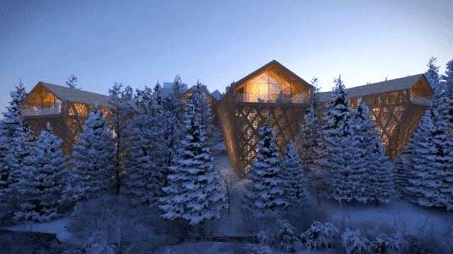 建築設計回應瞭(le)當地的鄉土建築,輕盈的外觀設計與自然坡度屋頂喚起瞭(le)自然的詩意。套房面積從60至80平,大面積的落地玻璃,在寒冷的冬季可以欣賞到白雪皚(ái)皚(ái)的壯美景象,夏天還能觀星賞月。